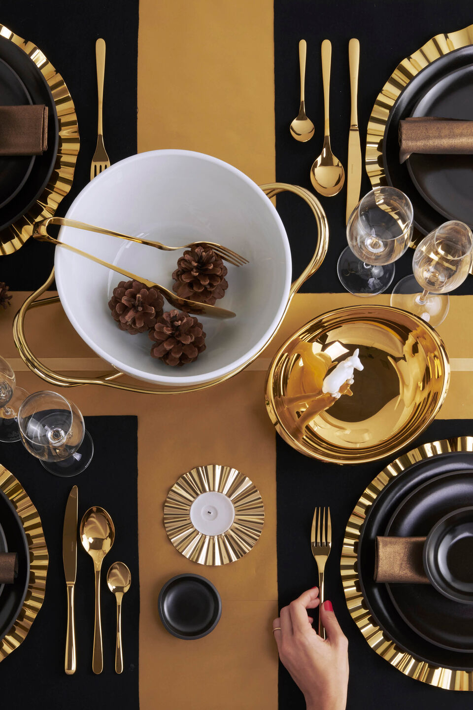 Festive and casual at the same time. Not only flatware sets in the unique Gold colour but also presentation plates and serving items. Express your creativity at the table, you can turn every day into a special day. Not only during the holidays!