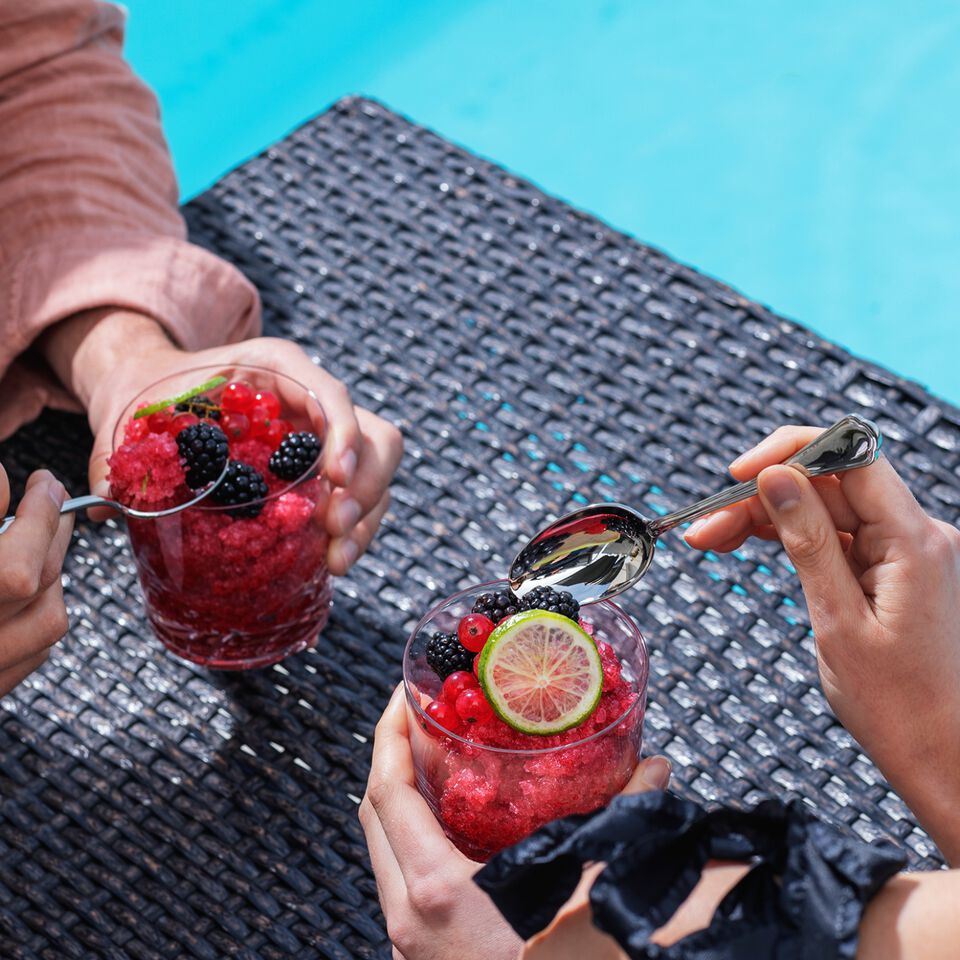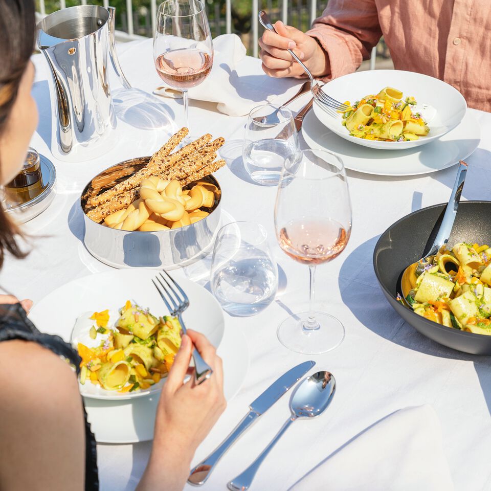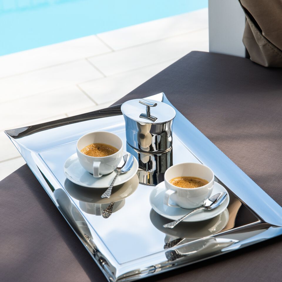 Choose stainless steel cutlery, serving trays, and napkin rings that are both weather-resistant and stylish. Sambonet’s serveware is made to shine indoors and out.