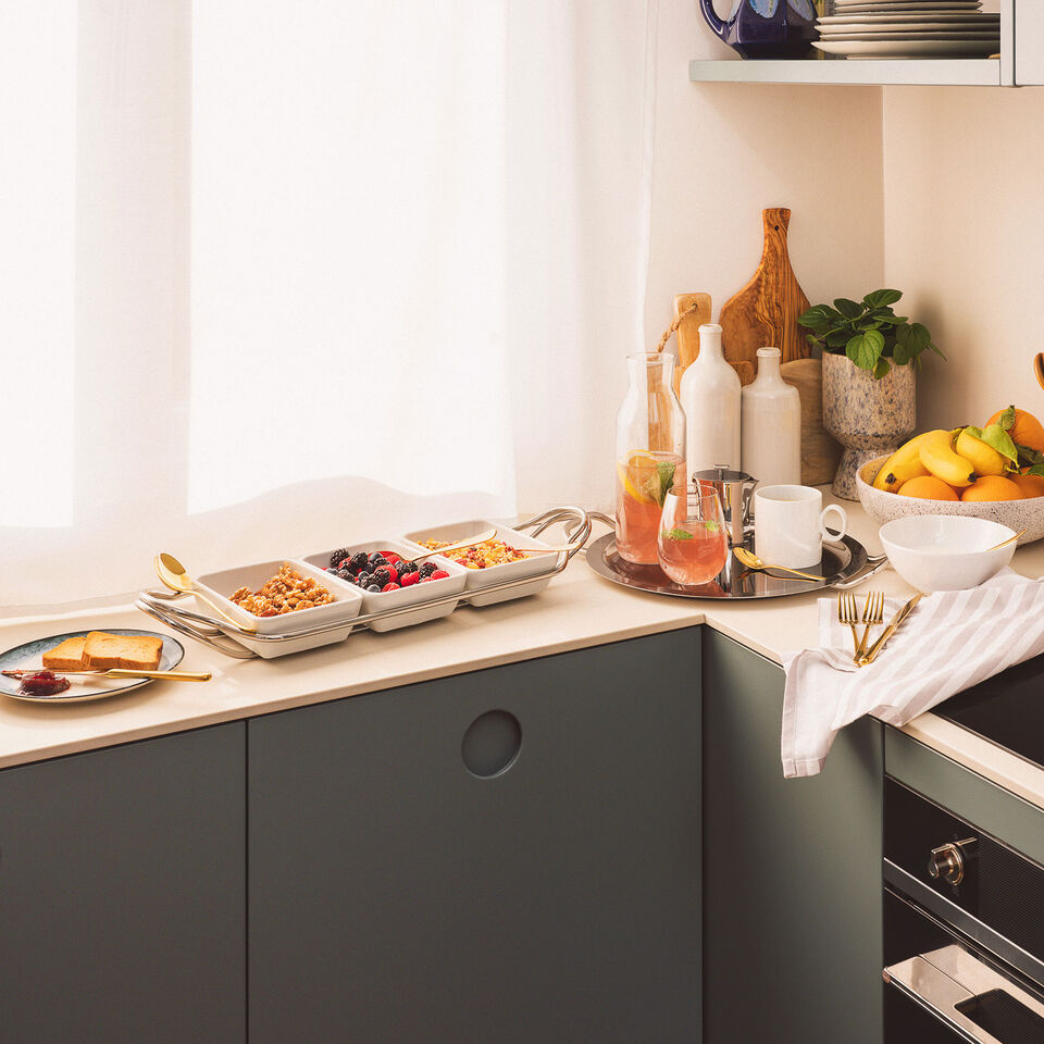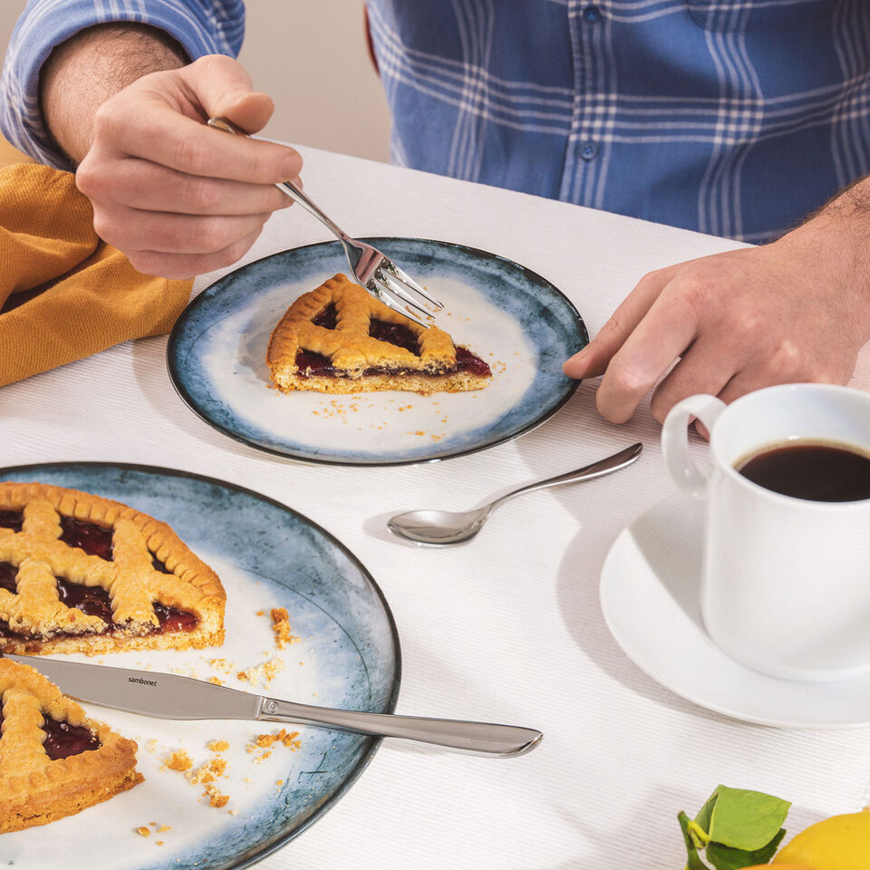 Flat plates, placed on show plates or directly on the tablecloth, are equally spaced one from another. If they are decorated, they are arranged toward the table edge and the guest to be seen properly. Soup plates or consommé bowls or hors d’oeuvre plates come next. The bread plate is arranged to the left of the flat plate, above it. Table setting includes the simultaneous presence of up to three plates, while other plates, like the salad bowl, accompany courses as they are served on a small table or a trolley. Hot food is always served on warm plates.