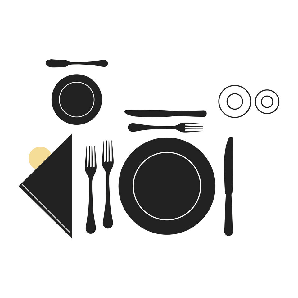 Flat plates, placed on underplates or directly on the tablecloth, are set equal distance apart and, if decorated, oriented toward the outside of the table and the guest to be read properly. This is followed by the soup plate or cup for the consommé or appetizer plate. The bread plate to the left and above the flat plate. Up to three plates can be set at the same time the others, such as the salad plate, follow the courses placed on a small table or cart. Plates for hot dishes should always be served lukewarm.