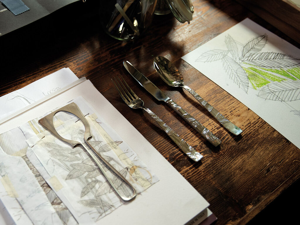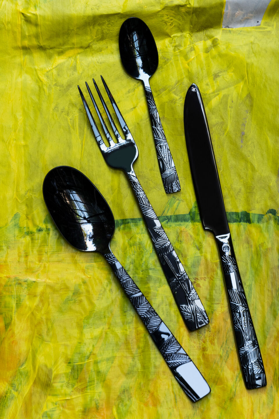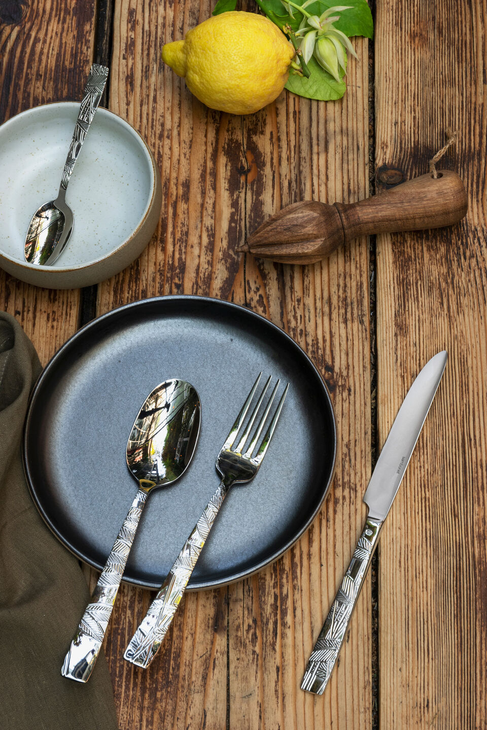Discover Jungle flatware, dessert fork and espresso spoon sets. Made of solid and rsistent stainless steel, the decor expresses a strong identity, the result of a fluid contamination between art, fashion and design.