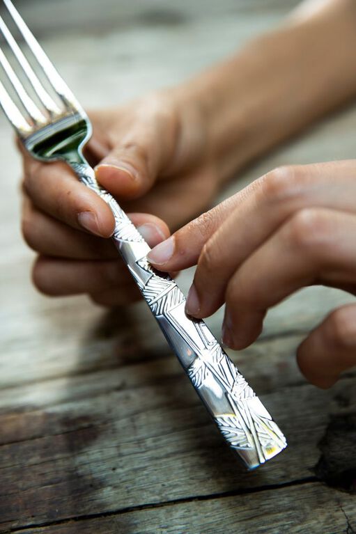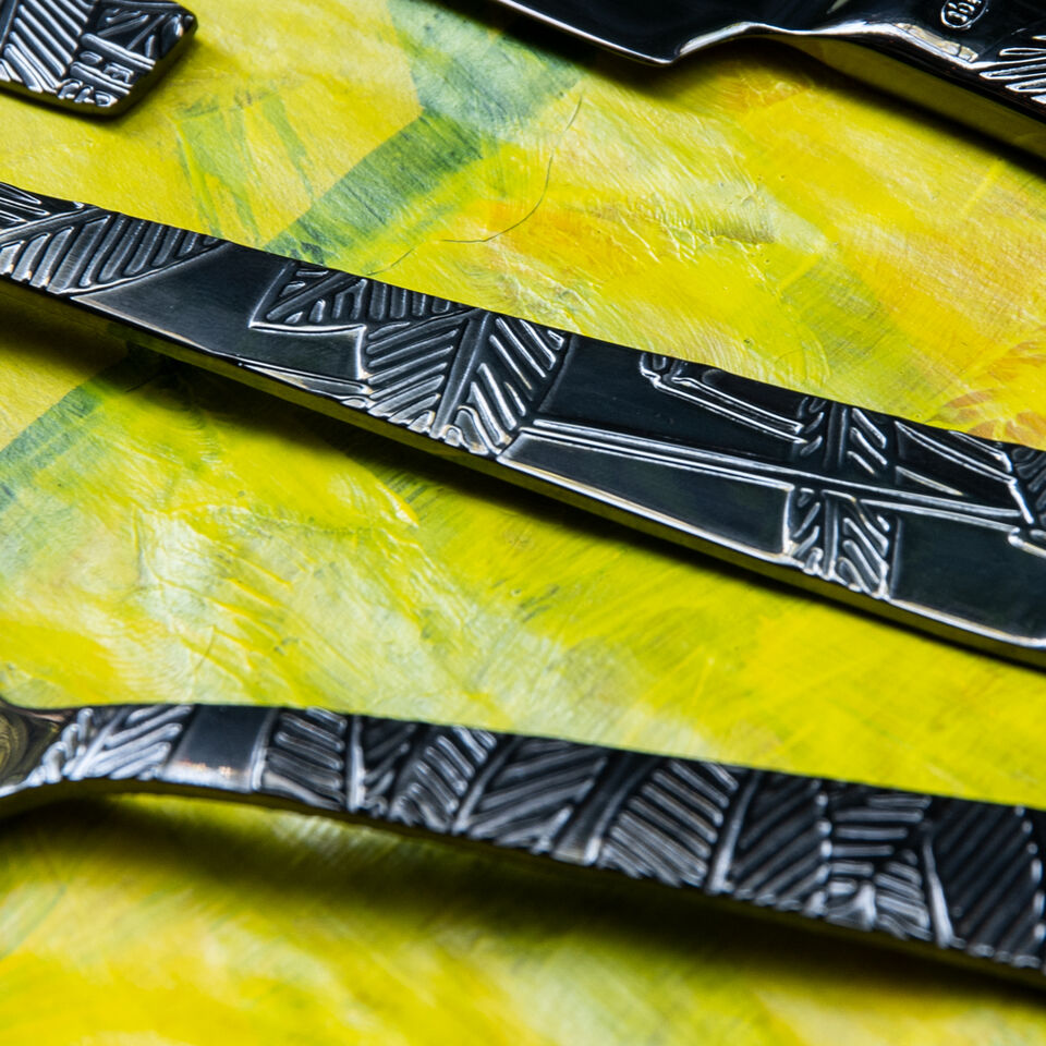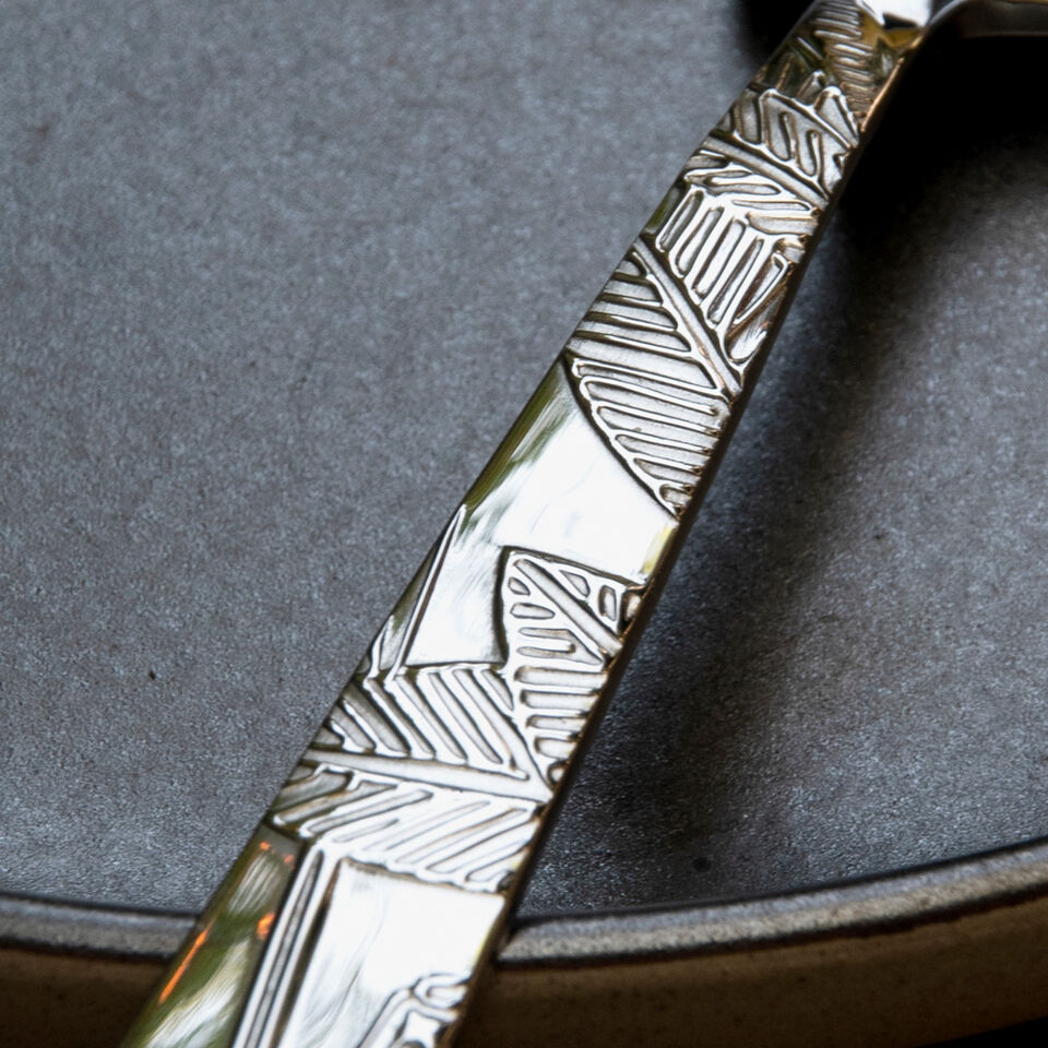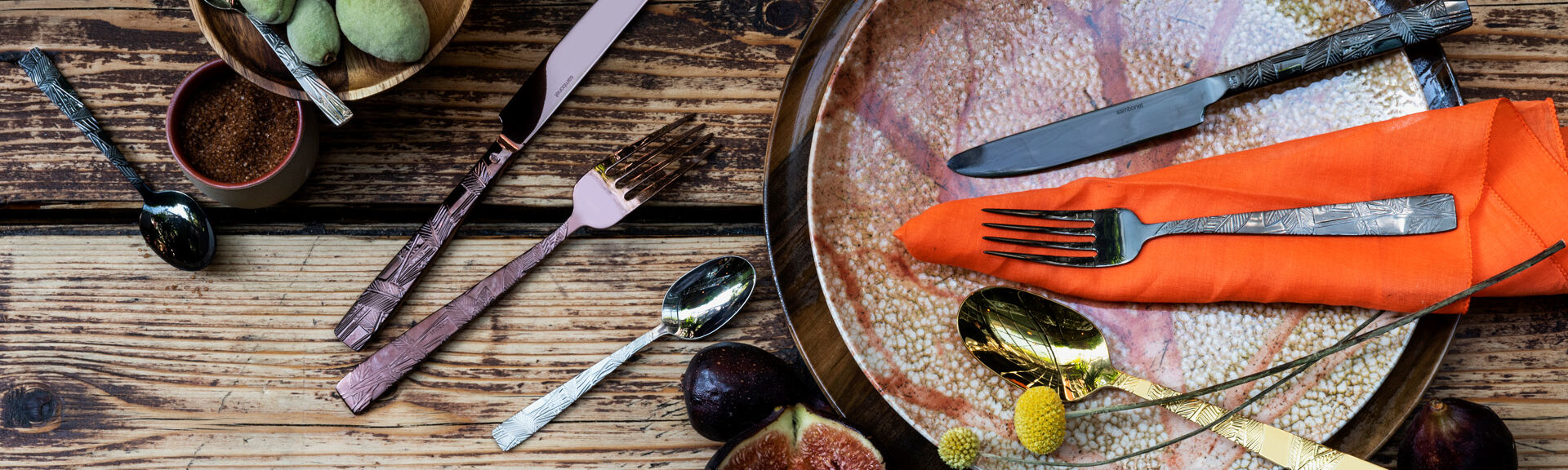 Discover Jungle flatware, dessert fork and espresso spoon sets. Made of solid and rsistent stainless steel, the decor expresses a strong identity, the result of a fluid contamination between art, fashion and design.
