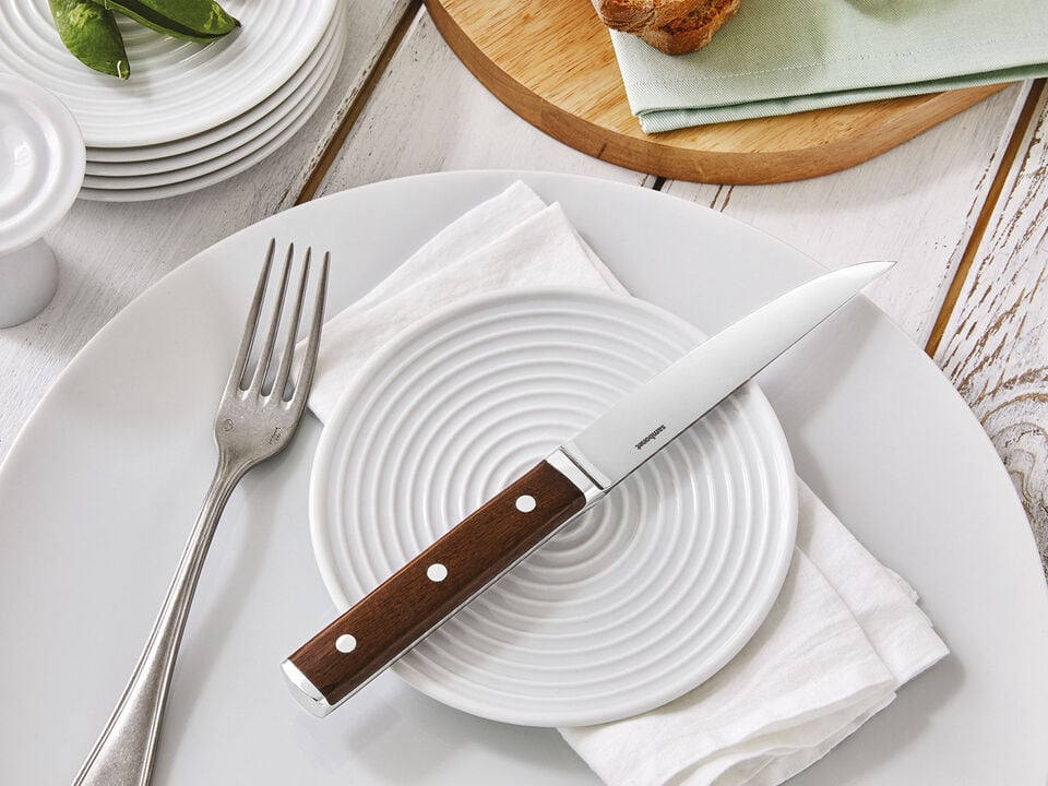 Sambonet combines fine Italian quality and eye for design with modern manufacturing techniques and craftsmanship. In fact, the first thing one notices is the appealing design of the knives. Their aesthetic is surmounted only by their functionality. For a more classic steak knife, Sambonet presents the T-Bone Steak Knife (serrated and non-serrated versions available) and the Knives Steak Knife (available with black or white handles). Sambonet also offers steak knives that are part of their flatware collections. The Baguette silver-plated steak knife sits perfectly alongside the Baguette flatware set, likewise for the Bamboo stainless steel steak knife or the Gio Ponti stainless steel steak knife completing its own collection. There we have it, designer handles with the sharpest of blades...a winning combination.